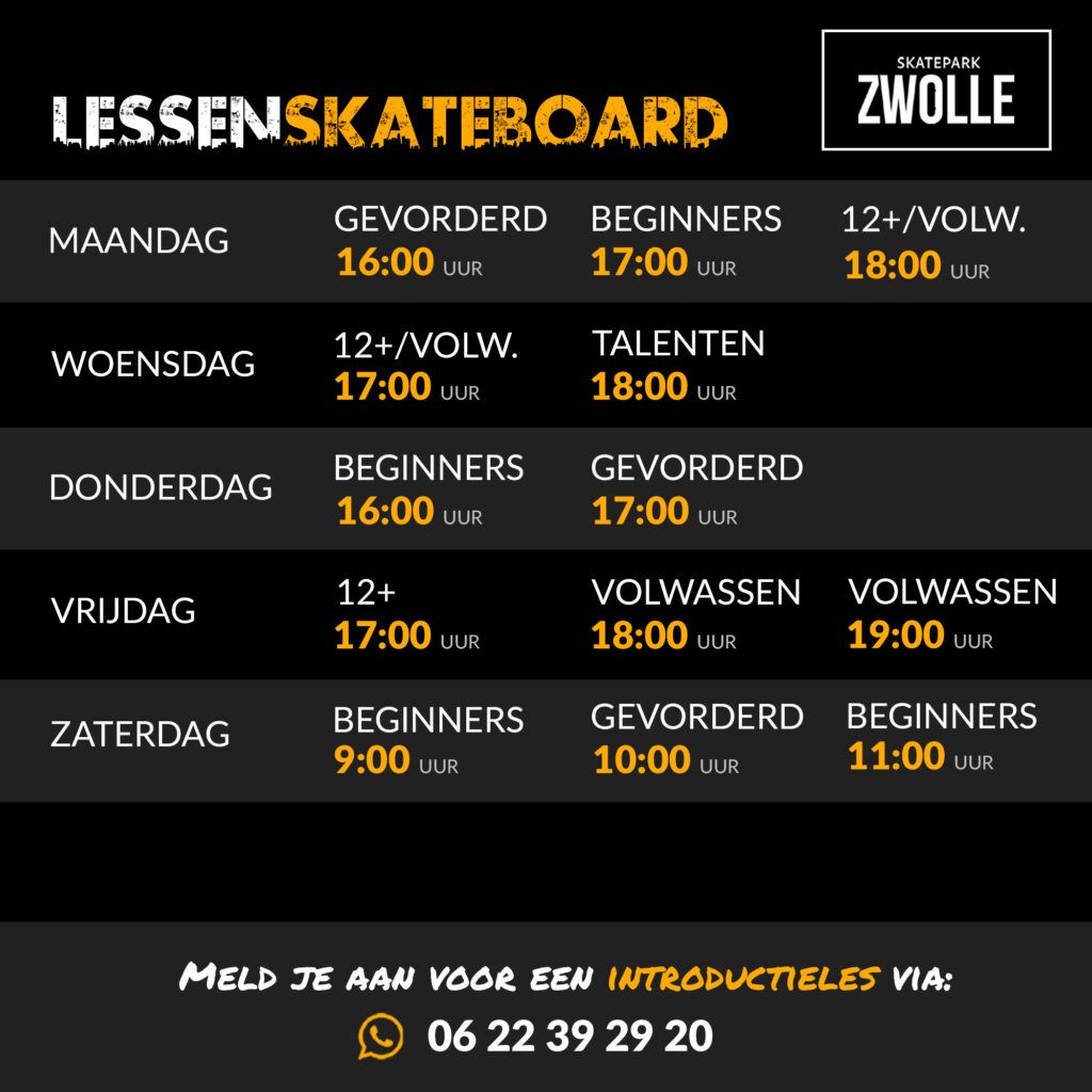 Voor scholen en andere groepen (vrijgezellenfeestjes, bedrijfsuitjes) bieden we skatelessen/clinics aan in ons indoorpark of op locatie. Kosten voor scholen zijn € 100,- per les van 60 minuten (alles inbegrepen). Voor vrijgezellenfeestjes en bedrijfsuitjes hanteren we een prijs van € 10 p.p. met een minimum tarief van € 100,-